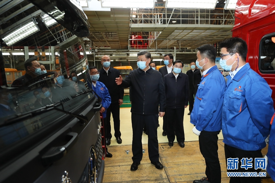 4月20日至23日,中共中央总书记、国家主席、中央军委主席习近平在陕西考察。这是4月22日,习近平在陕西汽车控股集团有限公司总装车间察看生产线,了解产品研发、生产、销售和复工复产情况。 新华社记者 鞠鹏 摄