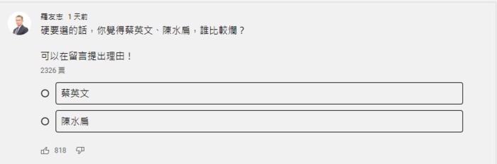 台资深媒体人罗友志Youtube频道网络投票截图。