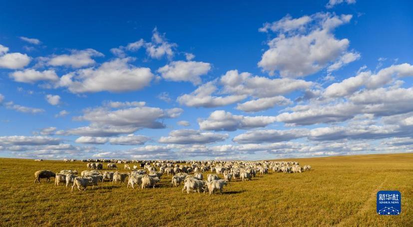 内蒙古锡林浩特市宝力根苏木上的羊群在觅食(2017年9月16日摄)。新华社记者 连振 摄