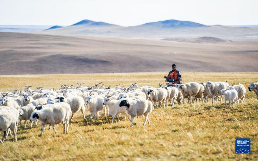 内蒙古锡林浩特市宝力根苏木牧民玛吉格的儿子钢苏格拉在草原上放羊(2017年9月16日摄)。新华社记者 连振 摄