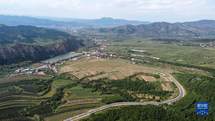 这是2021年8月30日拍摄的内蒙古赤峰市喀喇沁旗马鞍山村风光(无人机照片)。新华社记者 贝赫 摄