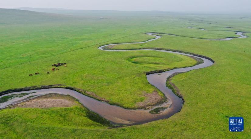 这是内蒙古锡林郭勒盟东乌珠穆沁旗乃林高勒的草原风光(2021年7月12日摄,无人机照片)。新华社记者 连振 摄