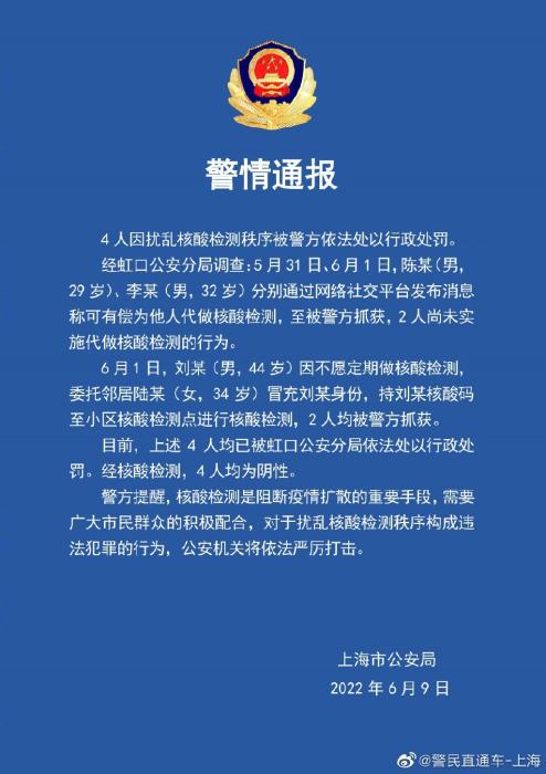 中新网6月9日电 上海市公安局9日在官方微博发布通报称,4人因扰乱核酸检测秩序被警方依法处以行政处罚。