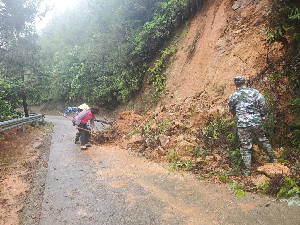 6月13日,福建省南平市光泽县李坊乡上观村组织人员清理道路溜方。(新华社发)