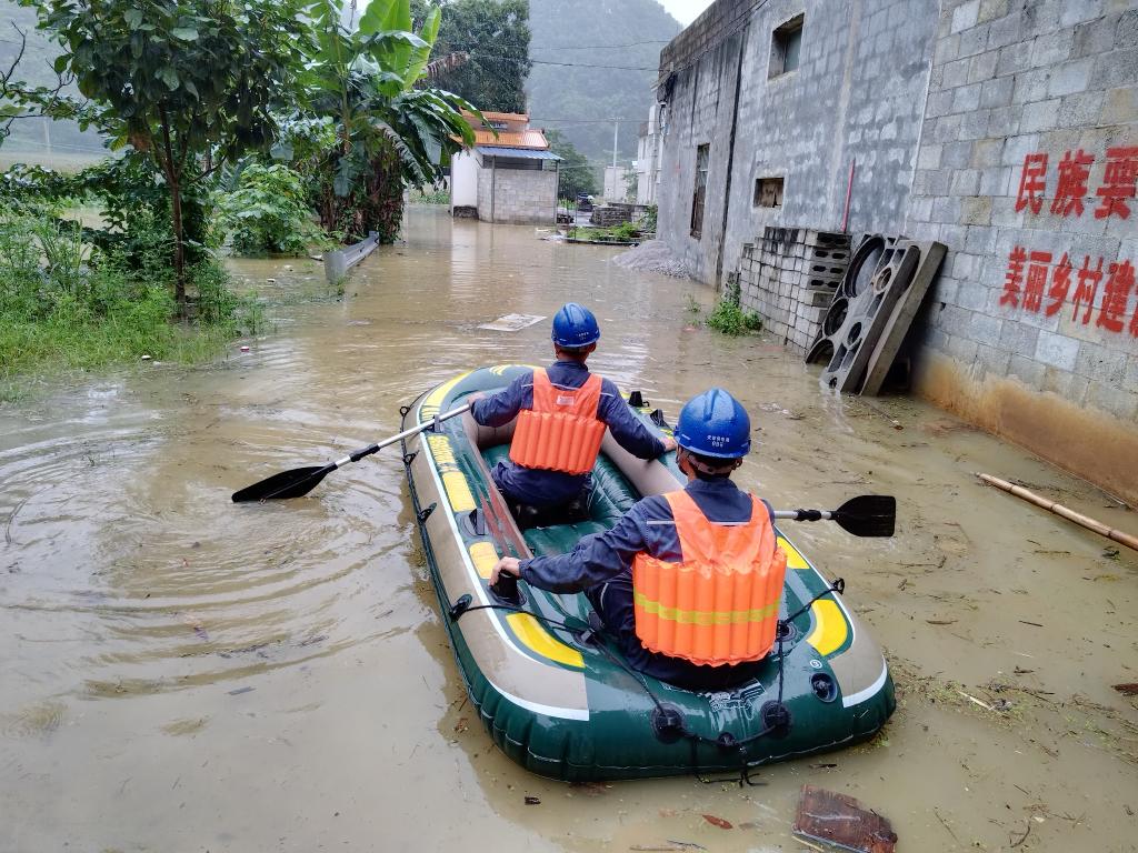 6月11日,南方电网天等供电局抢修人员乘坐皮划艇前往天等县天等镇宏魁村三州屯检查供电设备受灾情况,为恢复供电做准备。(新华社发)