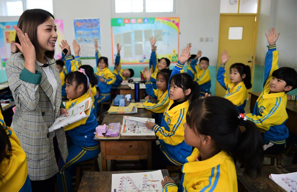 2021年9月26日,在河北省盐山县小营乡大左中心小学,新来的特岗教师王婷婷为三年级的学生上英语课。2021年,盐山县选拔招聘了244名特岗教师。新华社发(傅新春摄)