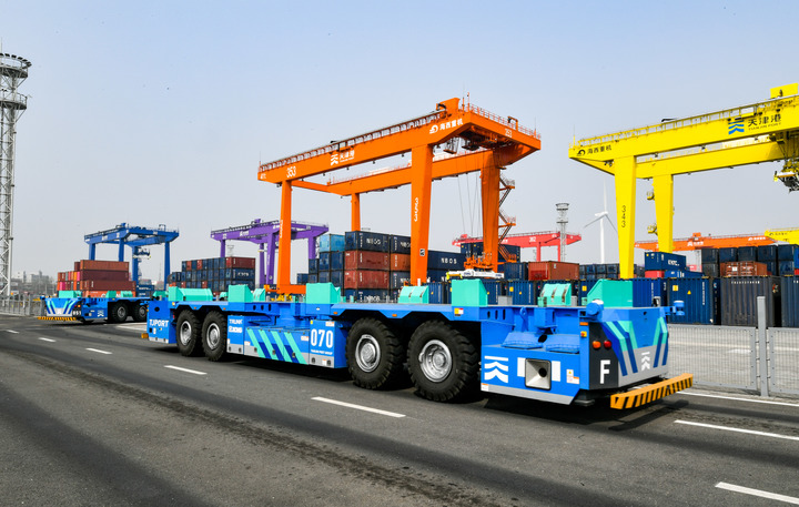 4月9日,在天津港北疆港区C段智能化集装箱码头,智能水平运输机器人在堆场内行驶。新华社记者 孙凡越 摄