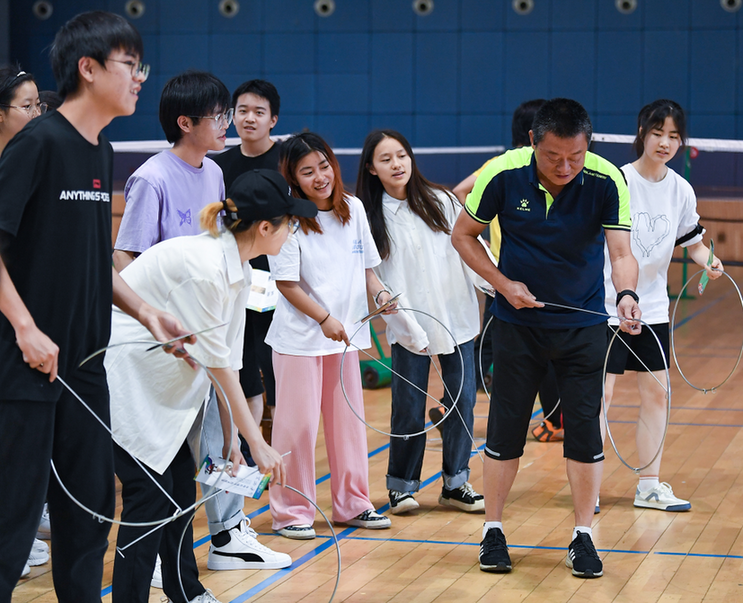 5月23日,在四川大学江安校区体育馆,体育老师在指导学生体验传统体育项目滚铁环。新华社记者王曦摄