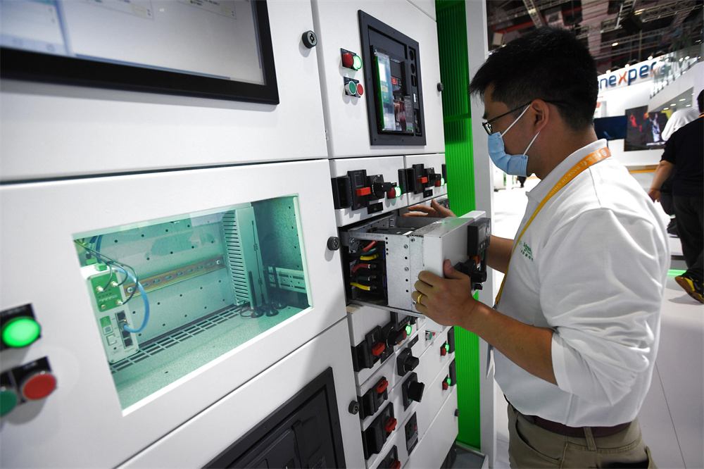 2020年11月5日,在上海举行的第三届进博会技术装备展区,施耐德电气展台工作人员在操作“Okken新一代预智低压成套设备”。新华社记者李任滋 摄