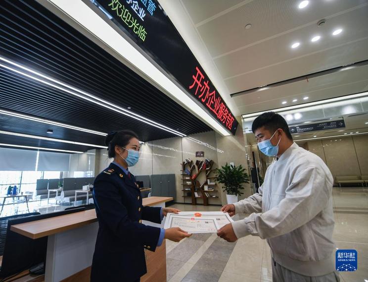 2020年11月10日,在浙江省杭州市临安区行政服务中心的开办企业服务专区,蒋先生(右)从工作人员手中接过营业执照。新华社记者徐昱 摄