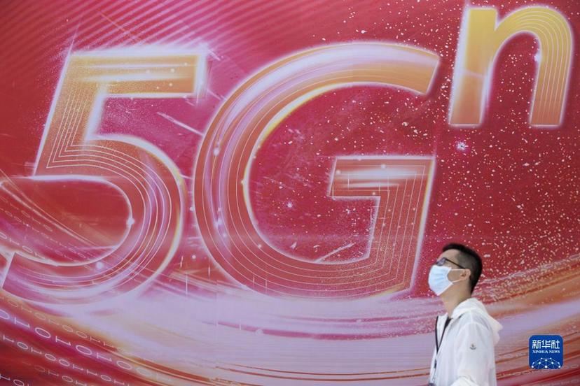 在2022世界5G大会展厅里,一名参展商走过展板(2022年8月10日摄)。新华社记者 张涛 摄