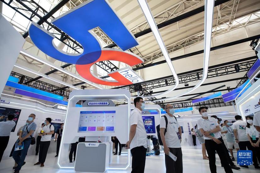 在2022世界5G大会中国电信集团有限公司展区,参观者现场了解5G产品(2022年8月10日摄)。新华社记者 张涛摄