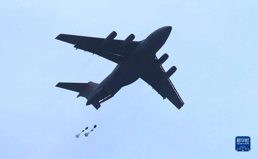 中国空军大型运输机运-20与空降兵部队联合开展空降空投训练(资料照片)。新华社发
