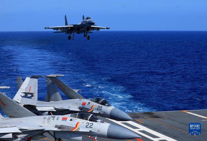 海军辽宁舰编队远海实战化训练期间,歼-15舰载战斗机准备着舰(资料照片)。新华社发(胡善敏 摄)