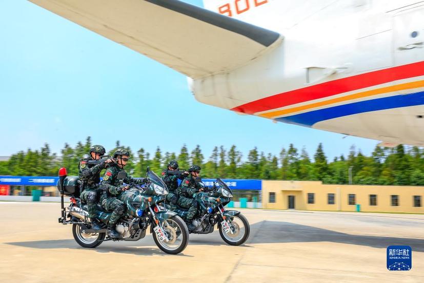 武警上海总队机动第一支队特战某中队组织交通工具反劫持综合演练,特战队员乘坐摩托车接近“被劫持飞机”(2022年8月1日摄)。新华社发(李岩摄)