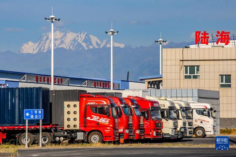 货运卡车在乌鲁木齐国际陆港区排队等待检验(2022年7月14日摄)。新华社发(蔡增乐 摄)