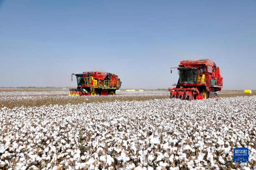 在新疆巴音郭楞蒙古自治州尉犁县兴平镇统其克村,两台国产采棉机在采收棉花(2022年9月30日摄)。新华社发(汪志鹏摄)
