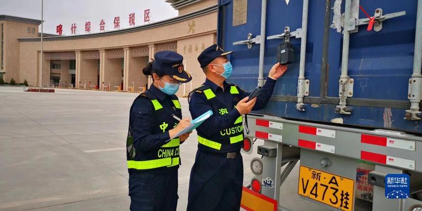 海关现场关员在喀什综合保税区登记入区车辆电子锁信息(2022年9月14日摄)。新华社发(图尔罕·麦麦提伊敏 摄)