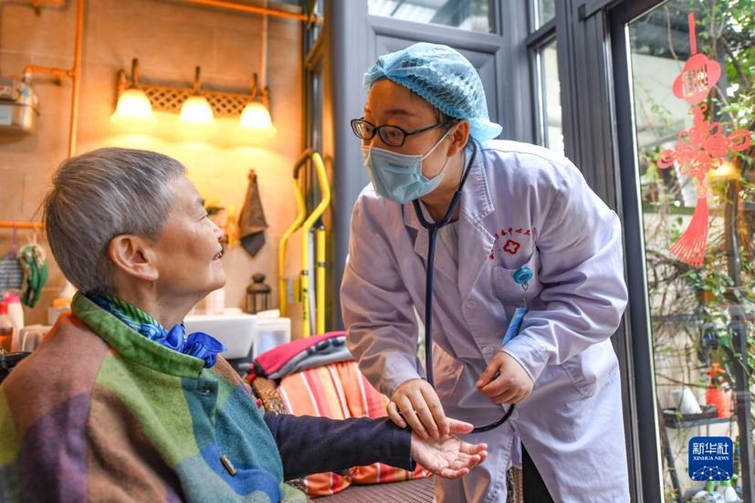 在四川省成都市温江区万春镇天乡路社区居民家中,家庭医生杨静(右)在询问居民叶茂群近期的身体情况(2022年5月18日摄)。新华社记者王曦 摄