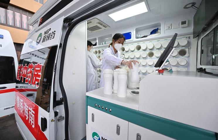 2022年8月20日,在海南三亚一家酒店附近,工作人员在“流动应急智能中药房”里将盛有单味中药浓缩颗粒的药瓶放入发药机。新华社记者郭程 摄