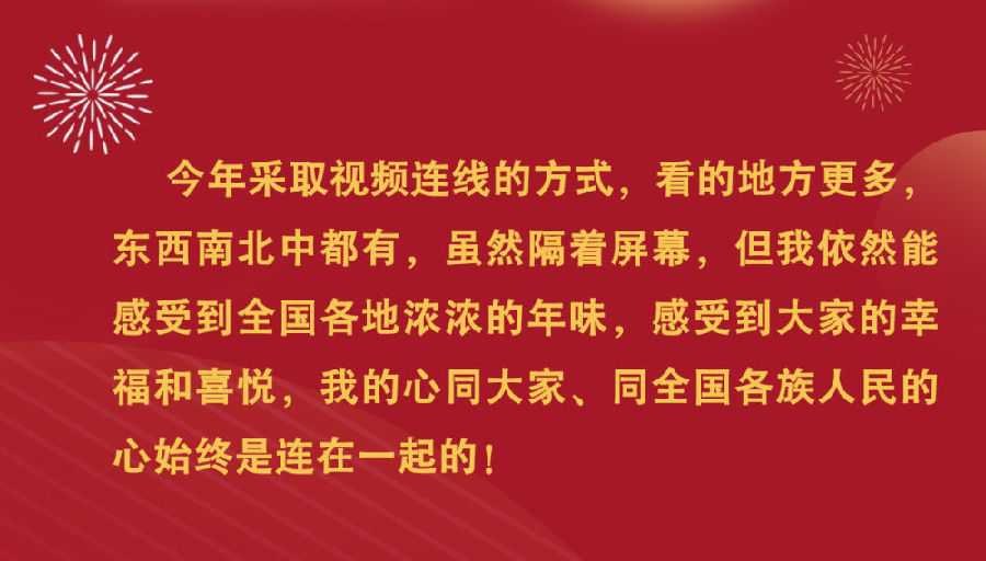 1月18日,中共中央总书记、国家主席、中央军委主席习近平在北京通过视频连线看望慰问基层干部群众,向全国各族人民致以新春的美好祝福。