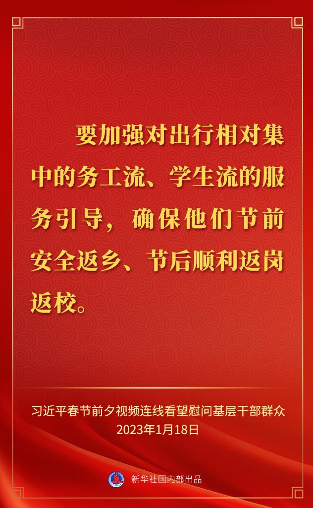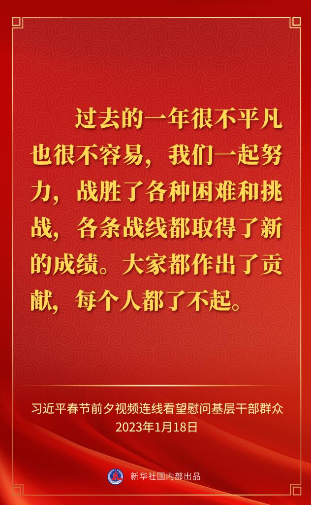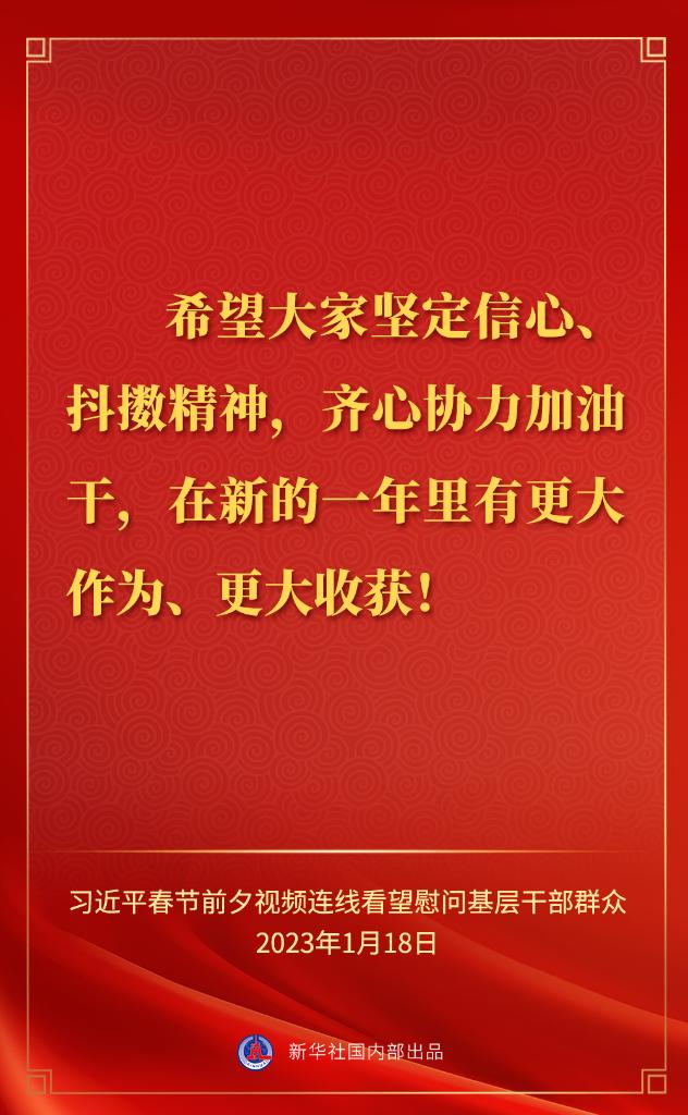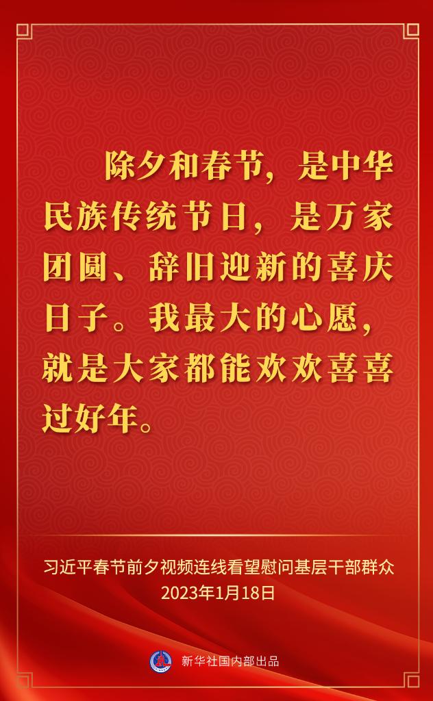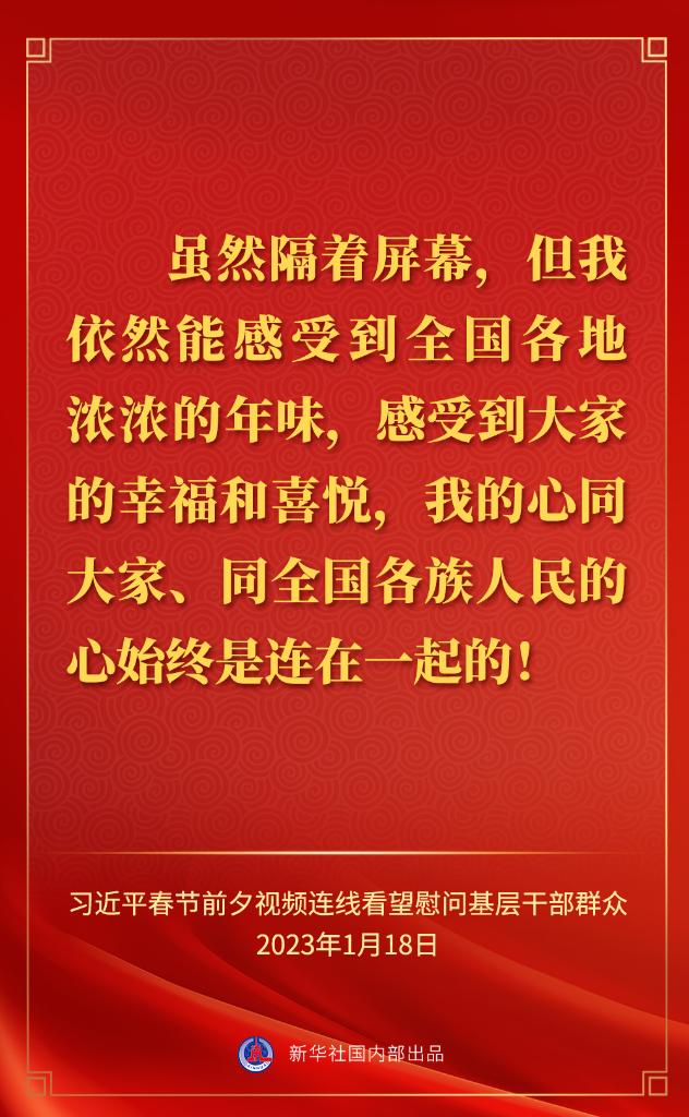 春节即将到来之际,中共中央总书记、国家主席、中央军委主席习近平通过视频连线看望慰问基层干部群众,向全国各族人民致以新春的美好祝福,祝各族人民身体健康、阖家幸福、事业进步、兔年吉祥!祝愿伟大祖国繁荣昌盛、国泰民安!