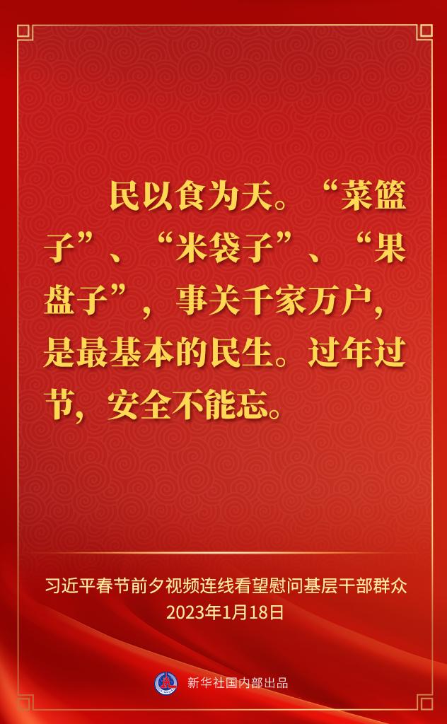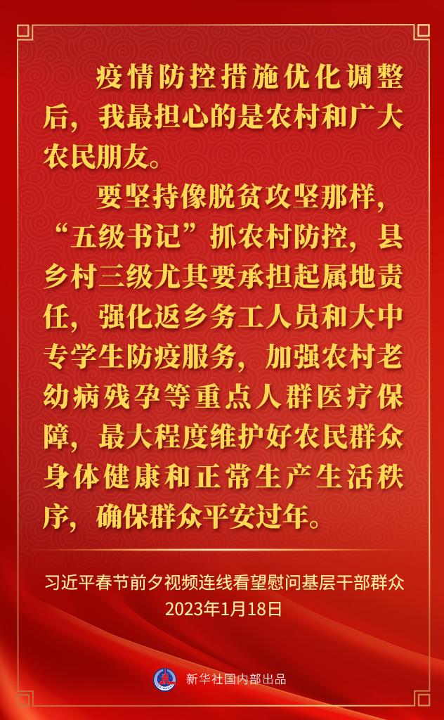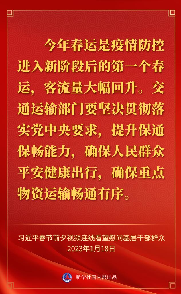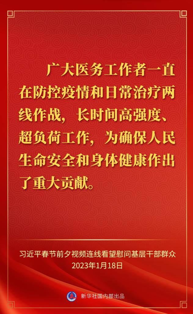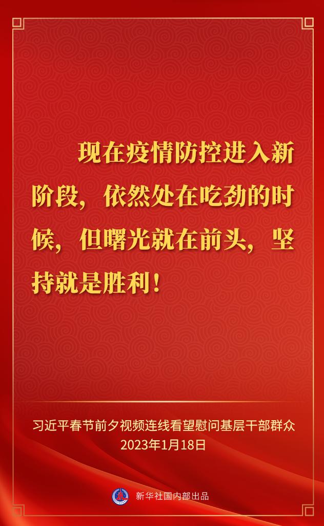 春节即将到来之际,中共中央总书记、国家主席、中央军委主席习近平通过视频连线看望慰问基层干部群众,向全国各族人民致以新春的美好祝福,祝各族人民身体健康、阖家幸福、事业进步、兔年吉祥!祝愿伟大祖国繁荣昌盛、国泰民安!