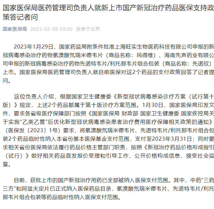 2023年1月29日,国家药监局附条件批准上海旺实生物医药科技有限公司申报的新冠病毒感染治疗药物氢溴酸氘瑞米德韦片(商品名称:民得维)、海南先声药业有限公司申报的新冠病毒感染治疗药物先诺特韦片/利托那韦片组合包装(商品名称:先诺欣)上市。国家医保局医药管理司负责人就目前医保对这2个药品的支付政策回答了记者提问。