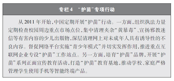 加强青少年网络法治宣传教育。青少年是祖国的未来、民族的希望。青少年网民在中国网民中的占比逐步增长。作为互联网的“原住民”,青少年是网上学习、交流、生活最活跃的参与者、实践者,其合法权益也更易受到网络违法活动的侵害。中国从保护青少年网络权益,促进青少年健康成长、全面发展出发,遵循青少年身心发展规律,贴近青少年学习生活实际,聚焦网络沉迷、网络欺凌、网络淫秽色情信息等重点问题,通过普法微综艺、儿童普法话剧、网络普法故事广播、网络普法云课堂、学法用法知识竞赛、法治副校长进校园、编写网络普法读本等生动活泼、丰富多彩的形式开展法治宣传教育,逐步形成了政府、社会、学校、家庭相结合的法治宣传教育格局,为提升青少年网民法治意识和网络安全素养提供了全面保障。
