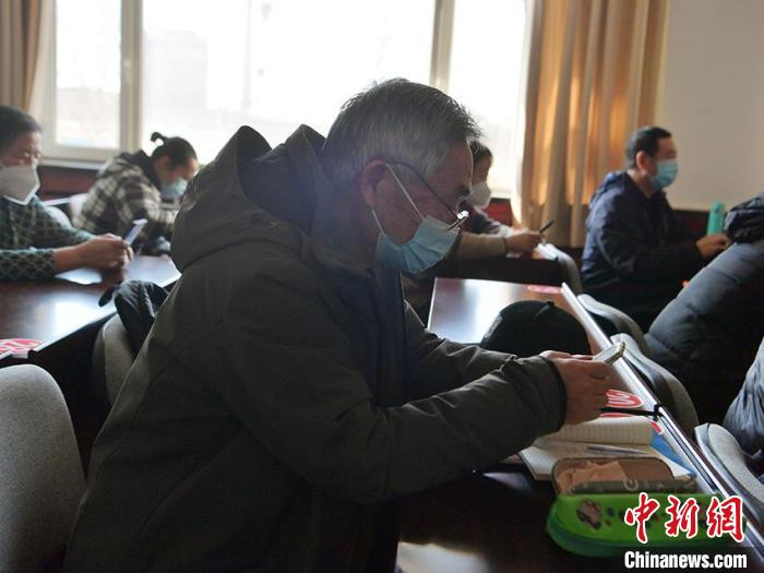 课间休息时,78岁的吴凤智抓紧时间“复盘”上课内容。 刘栋 摄