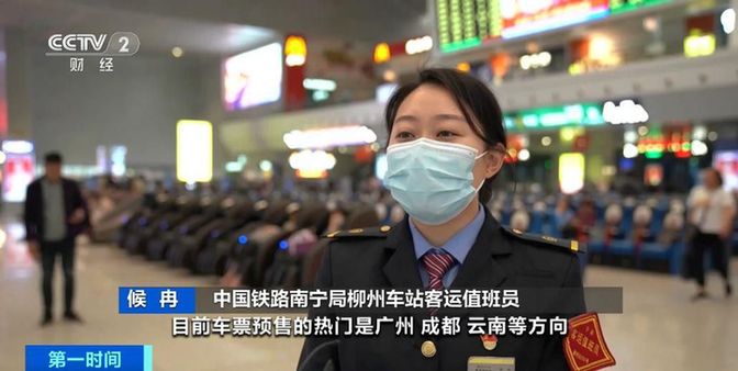 中国铁路南宁局柳州车站客运值班员候冉:目前车票预售的热门是广州、成都、云南等方向。预计整个五一假期,柳州站增加南宁、贺州等方向6趟车。