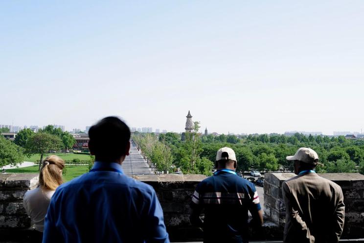 使节们在正定南城门城楼上眺望广惠寺华塔。新华社记者 邵艺博摄