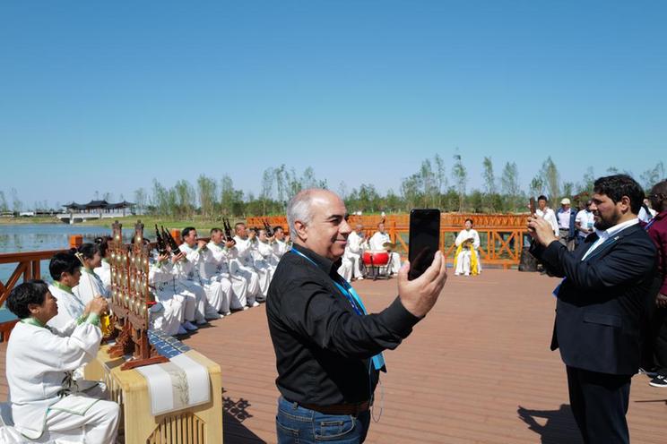 使节们在雄安新区白洋淀欣赏雄安古乐。新华社记者 邵艺博摄