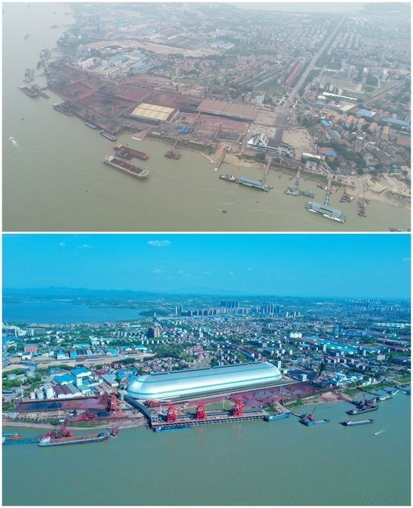 上图为城陵矶港提质改造前(2018年6月14日摄);下图为城陵矶港环保提质改造后(2020年4月14日摄)。(岳阳市委宣传部供图)