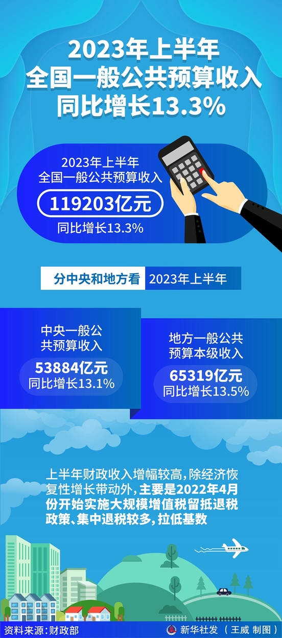 上半年全国一般公共预算收入同比增长13.3%