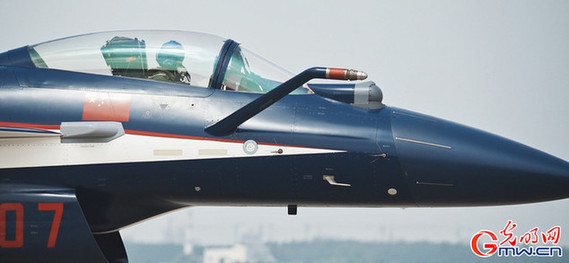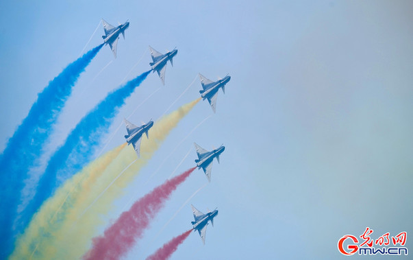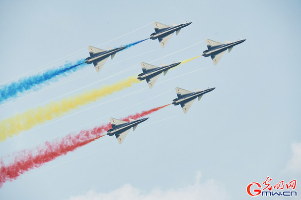 图为中国人民解放军空军八一飞行表演队换装歼10C后首次在国内公开亮相表演。(光明网记者李伯玺/摄)