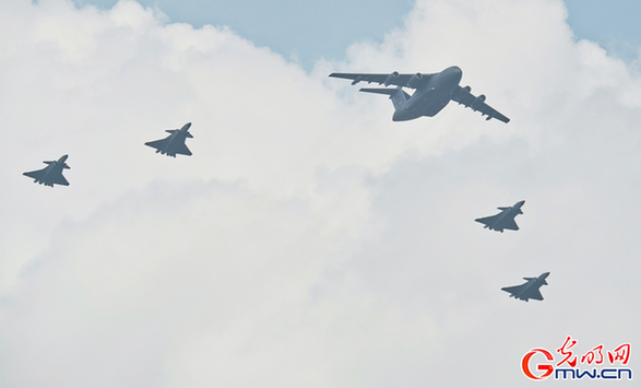 图为运油-20单机歼-20四机编队。(光明网记者李伯玺/摄)