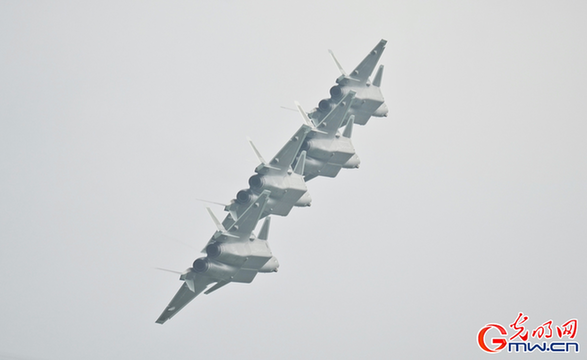图为中国自主研制生产的隐身战斗机歼-20四机编队。(光明网记者李伯玺/摄)
