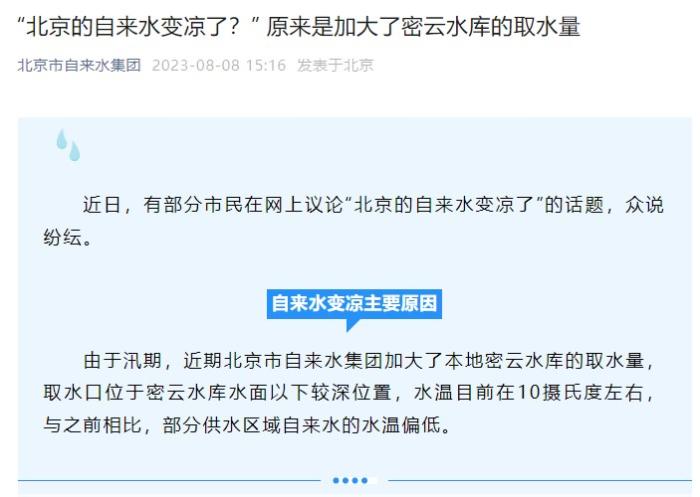 中新网8月8日电 据北京自来水集团微信公众号消息,近日,有部分市民在网上议论“北京的自来水变凉了”的话题,众说纷纭。