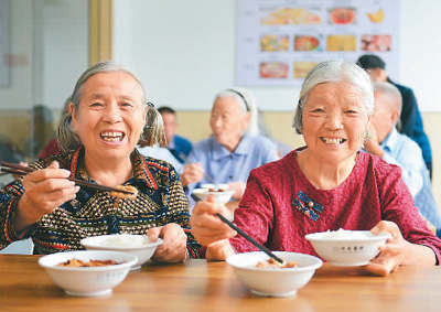 浙江省衢州市衢江区廿里镇斋堂新村老人们正在就餐。陈斌摄(人民视觉)
