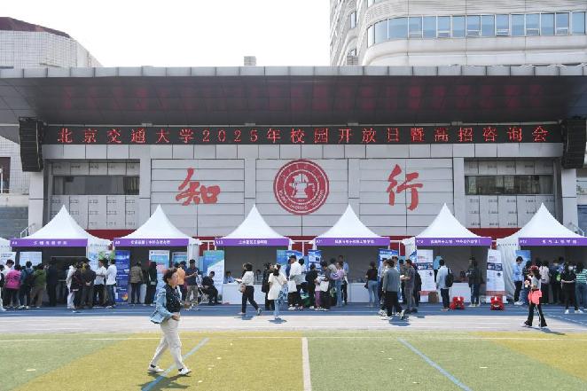 5月10日拍摄的北京交通大学2025年校园开放日暨高招咨询会现场。当日,北京交通大学举办2025年校园开放日暨高招咨询会,吸引北京及周边地区考生和家长前来参观咨询。来自京内外60余所院校共同参与本次活动,助力考生备战高考。新华社记者任超 摄