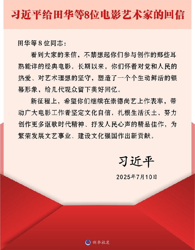 新华社北京7月11日电 近日,中共中央总书记、国家主席、中央军委主席习近平给田华等8位艺术家回信,对电影工作者提出殷切期望。
