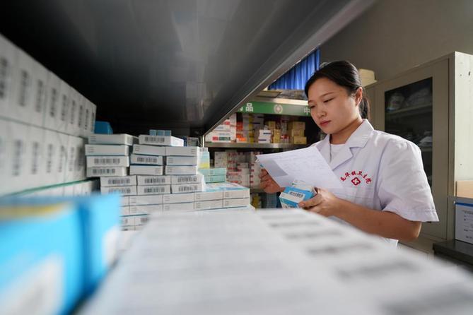 河北省柏乡县龙华镇卫生院药房工作人员在为患者取药。新华社记者牟宇 摄