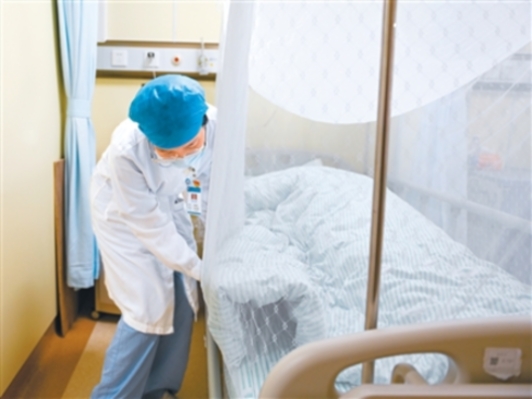 南方医科大学顺德医院的护士为患者整理床铺和蚊帐。新华社记者肖恩楠摄
