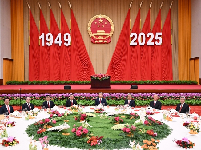 在欢快的乐曲声中,中外宾朋举杯共贺中华人民共和国成立76周年,祝福中国繁荣昌盛、人民幸福安康,祝愿中国人民和世界各国人民友谊长存。